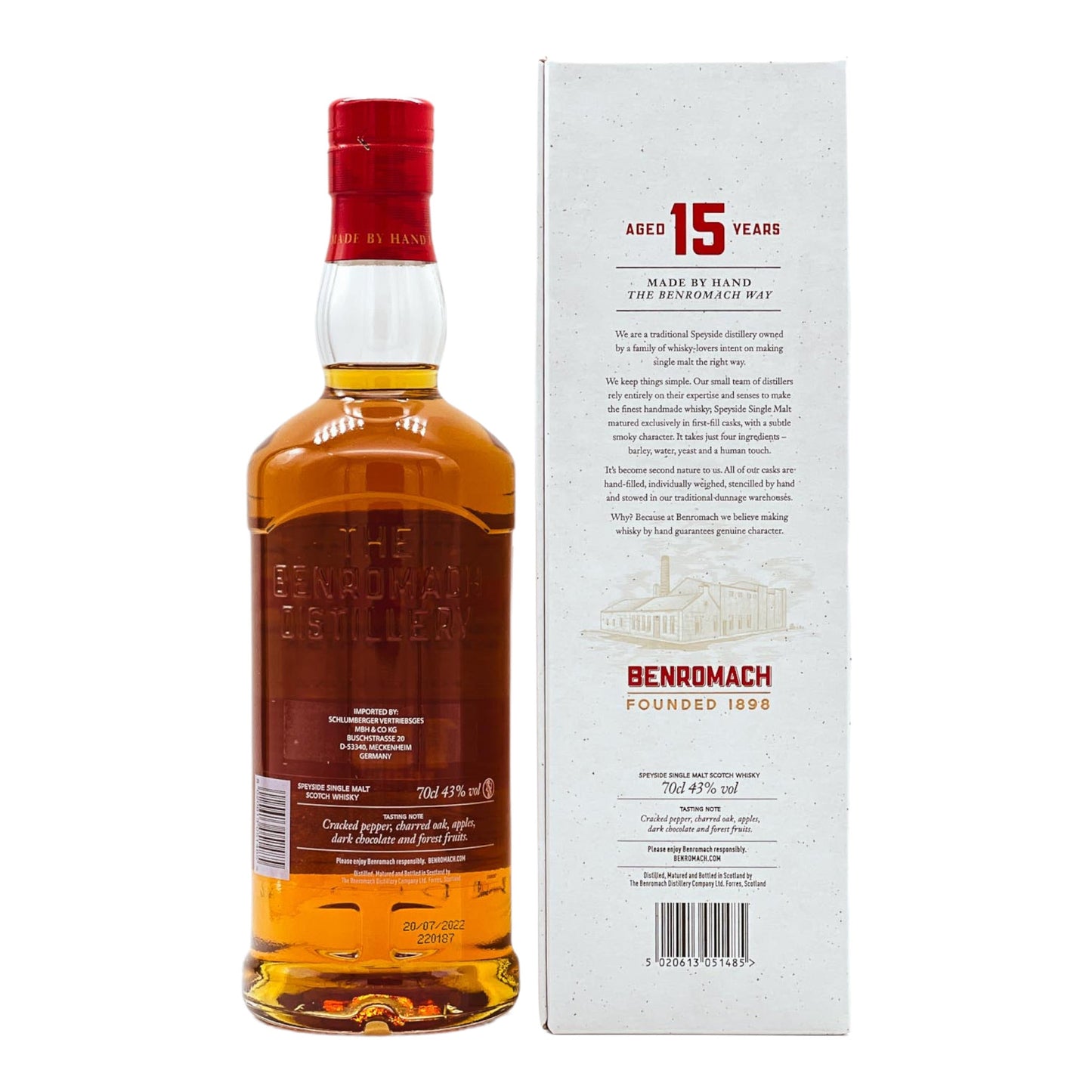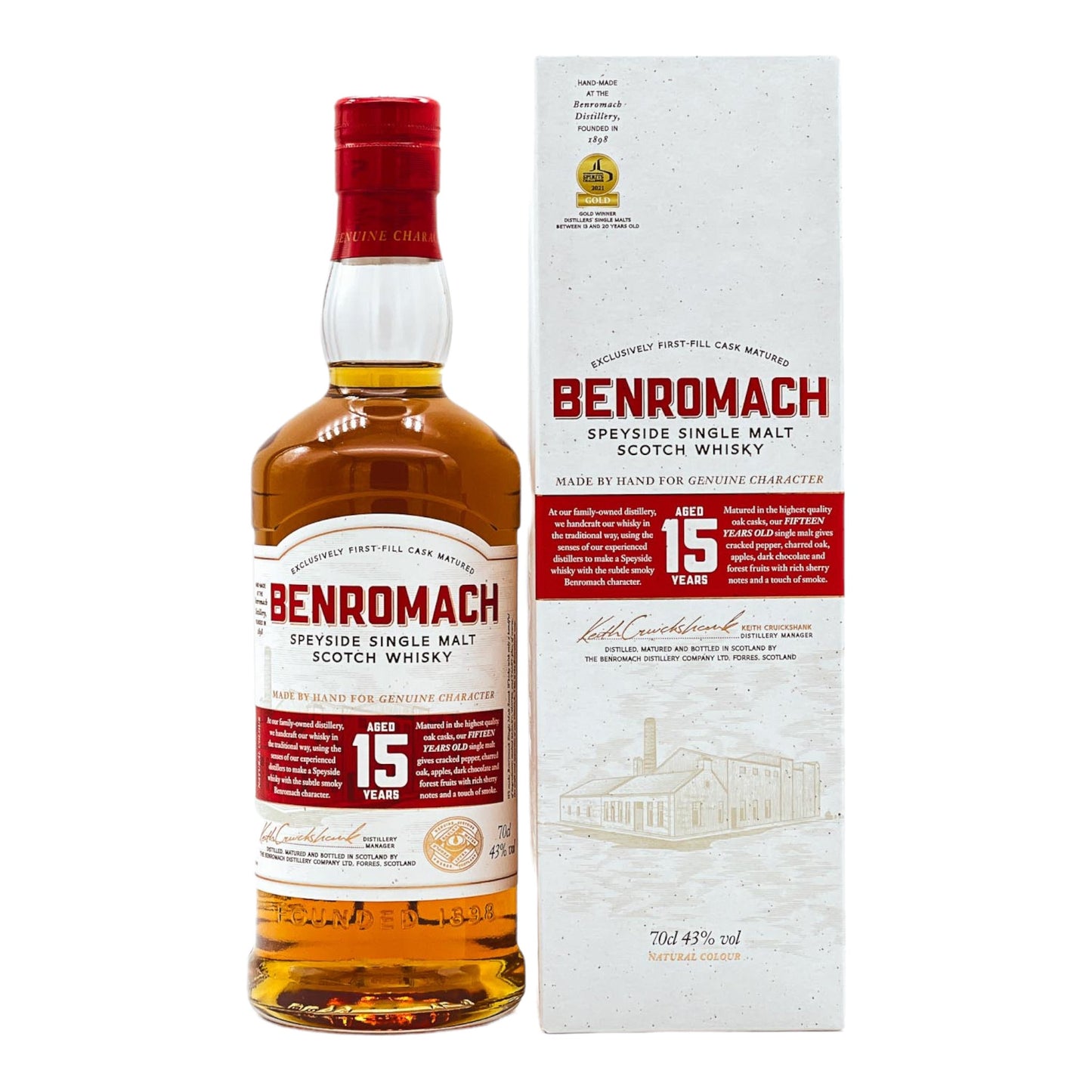 Dieser 15 Jahre alte Single Malt Whisky aus der Benromach Destillerie, der nur in den besten Eichenfässern reift, bietet rissigen Pfeffer, verkohlte Eiche, Äpfel, dunkle Schokolade und Waldfrüchte mit reichen Sherry-Noten und einem Hauch von Rauch.