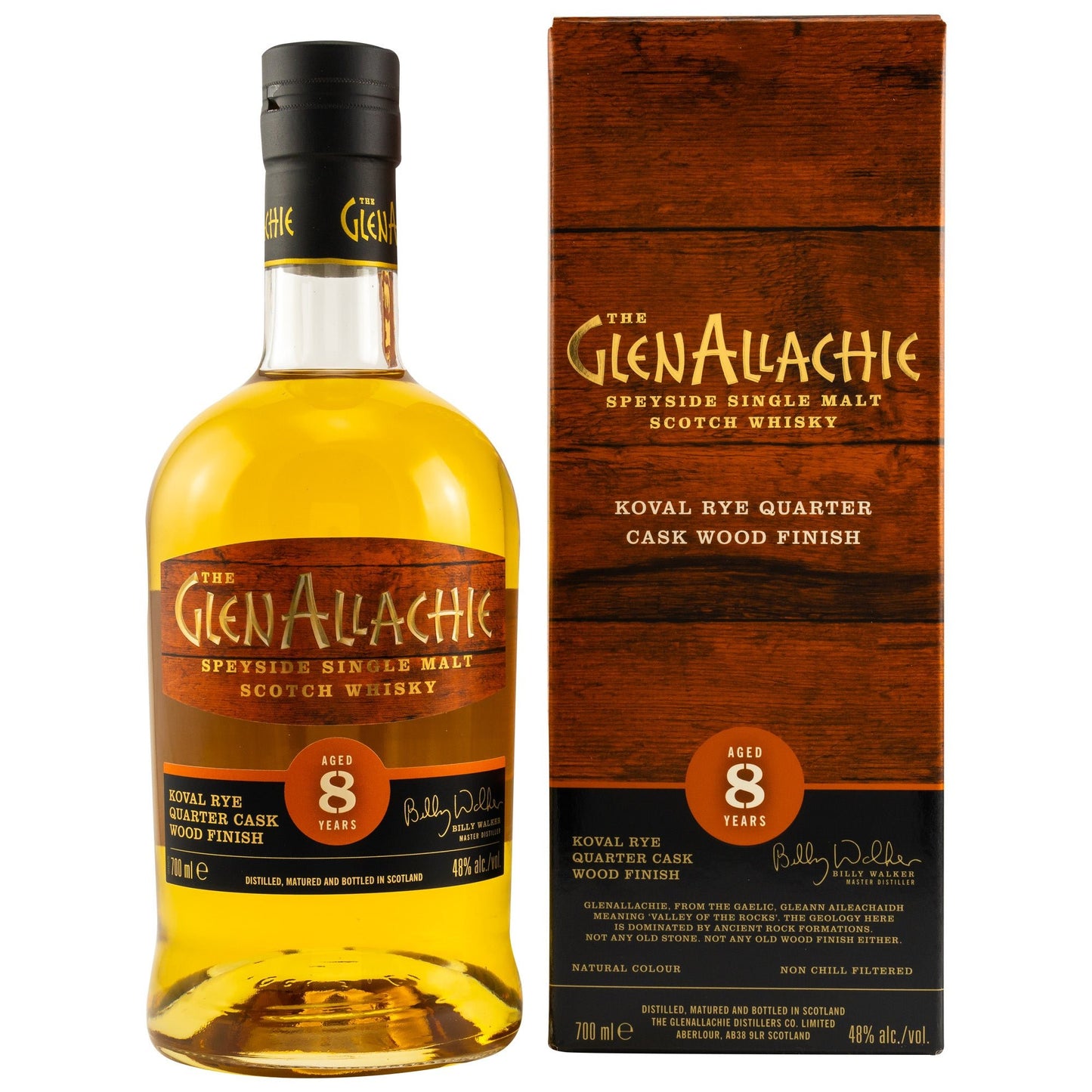 Im Spiel mit Fässern und ihrem Einfluss auf Single Malt ist Billy Walker unbestritten ein Meister. Der Glenallachie Koval Rye Quarter Cask ist eine neue Erfahrung in der Reifung. Er reifte zunächst in neuen amerikanischen Eichenfässern und erhielt dann ein Finish in ehemaligen Quarter Cask Fässern (kleine 125 Liter Fässer), die zuvor Roggenwhisky aus der Koval Destillerie in Chicago enthielten.