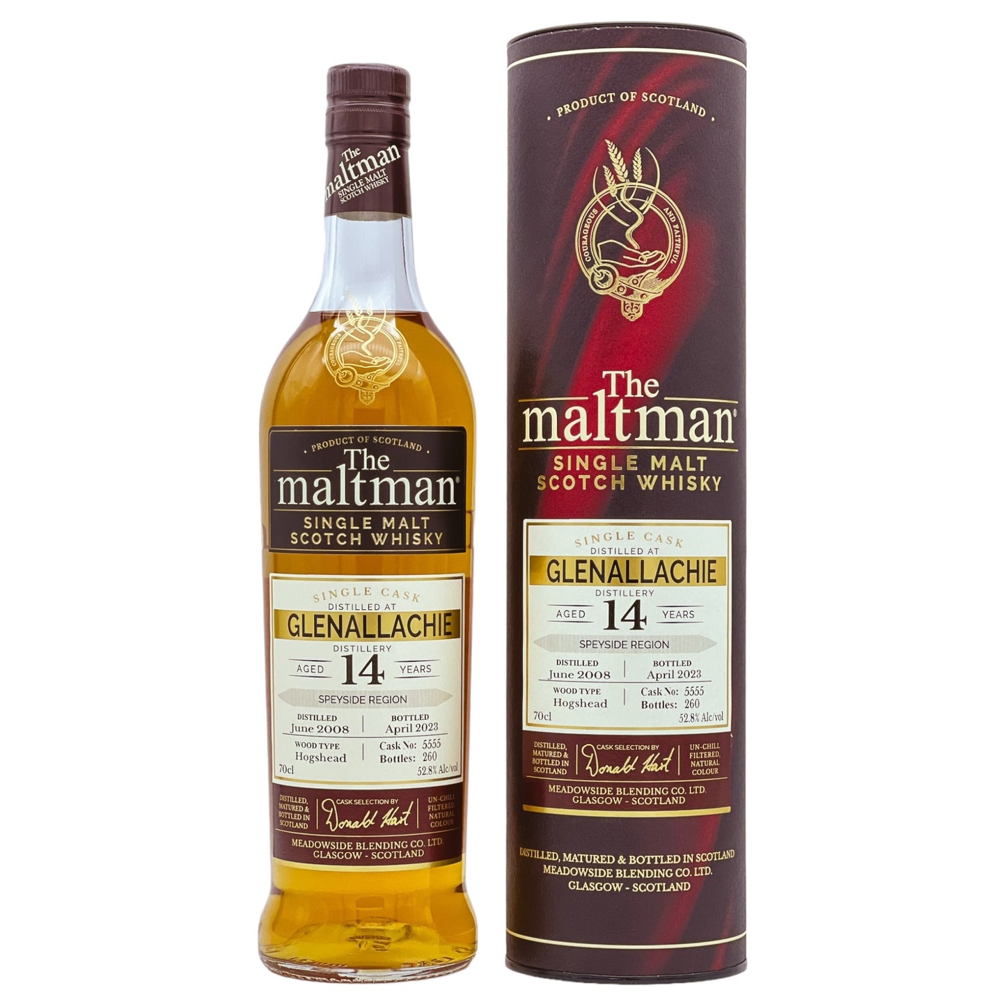 Der GlenAllachie, abgefüllt von The Maltman, ist ein 14 Jahre alter Single Malt Scotch Whisky, der in einem einzelnen Hogshead-Fass mit der Nummer 5555 gereift ist. Dieser Whisky wurde im April 2023 mit einem Alkoholgehalt von 52,8% abgefüllt. Von dieser Abfüllung wurden insgesamt 260 Flaschen freigegeben.