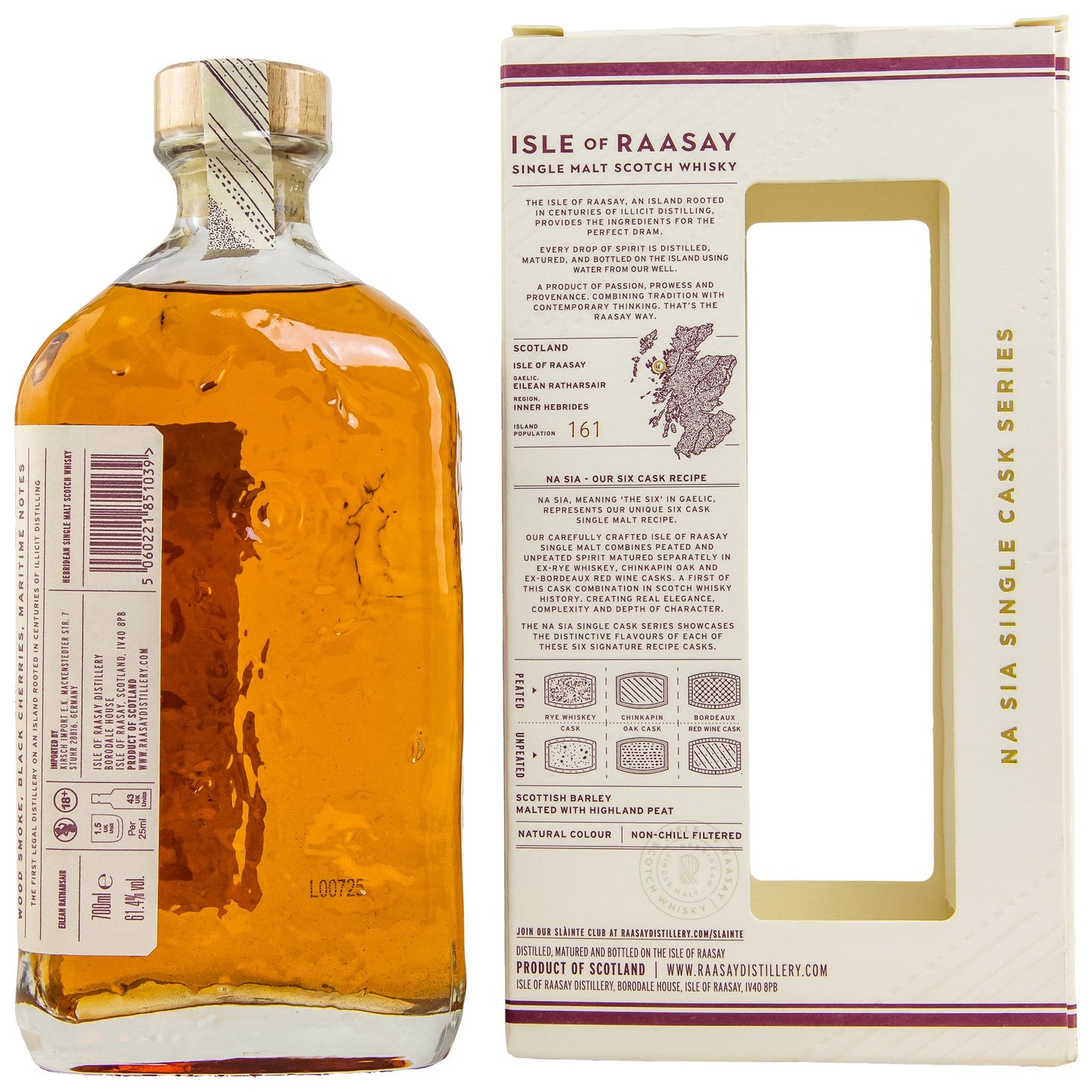 „Na Sia“ (gälisch für „die Sechs“) nennen die Inselbrenner ihr einzigartiges Whiskyrezept. Es kombiniert getorfte sowie ungetorfte Rohbrände der Brennerei. Beide Rohbrandsorten reifen separat voneinander an Raasays Küste in jeweils drei Fasstypen: First Fill Rye Whiskey Casks, Virgin Chinkapin Oak Casks und First Fill Bordeaux Red Wine Casks.